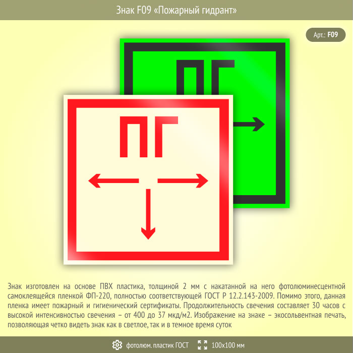 Знак F09 «Пожарный гидрант» (фотолюминесцентный пластик ГОСТ 34428-2018, 100х100 мм) в Пензе купить