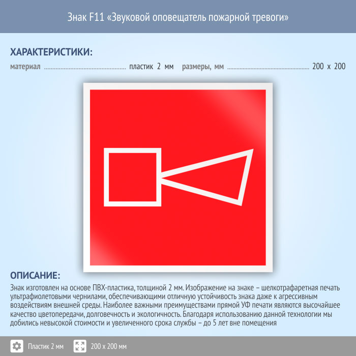 Знак F11 «Звуковой оповещатель пожарной тревоги» (пластик, 200х200 мм) в Пензе купить