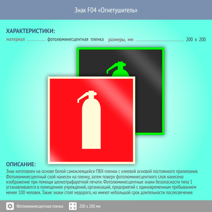 Знак F04 «Огнетушитель» (фотолюминесцентная пленка, 200х200 мм) в Пензе купить