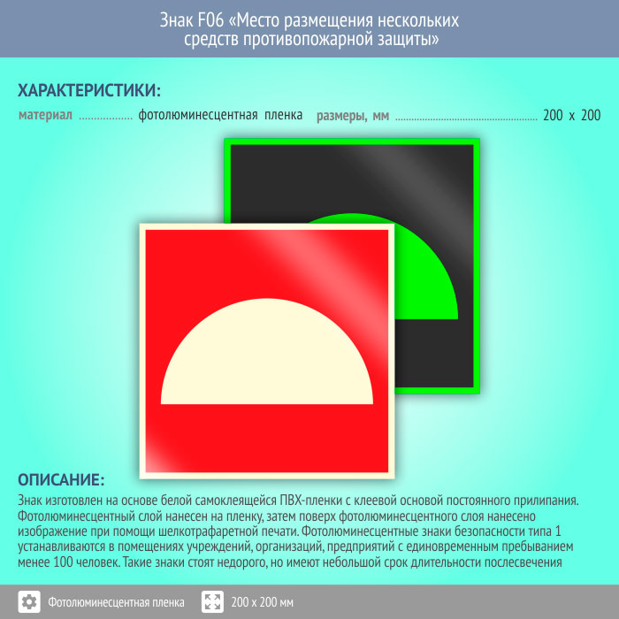 Знак F06 «Место размещения нескольких средств противопожарной защиты» (фотолюминесцентная пленка, 200х200 мм) в Пензе купить