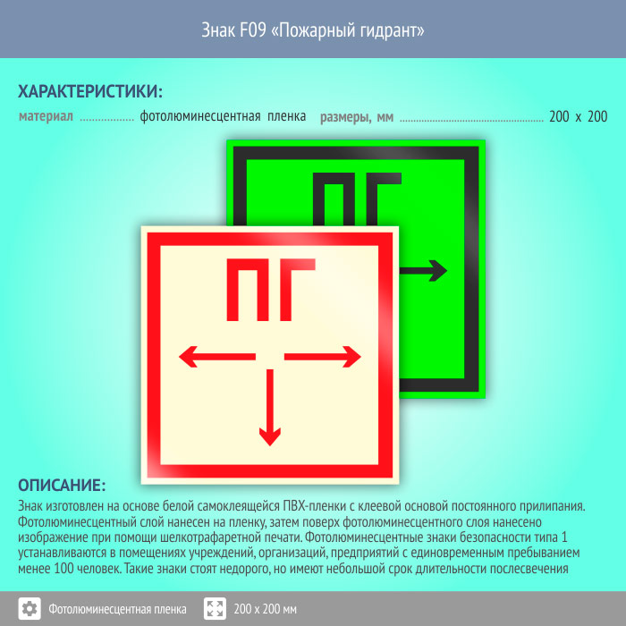 Знак F09 «Пожарный гидрант» (фотолюминесцентная пленка, 200х200 мм) в Пензе купить
