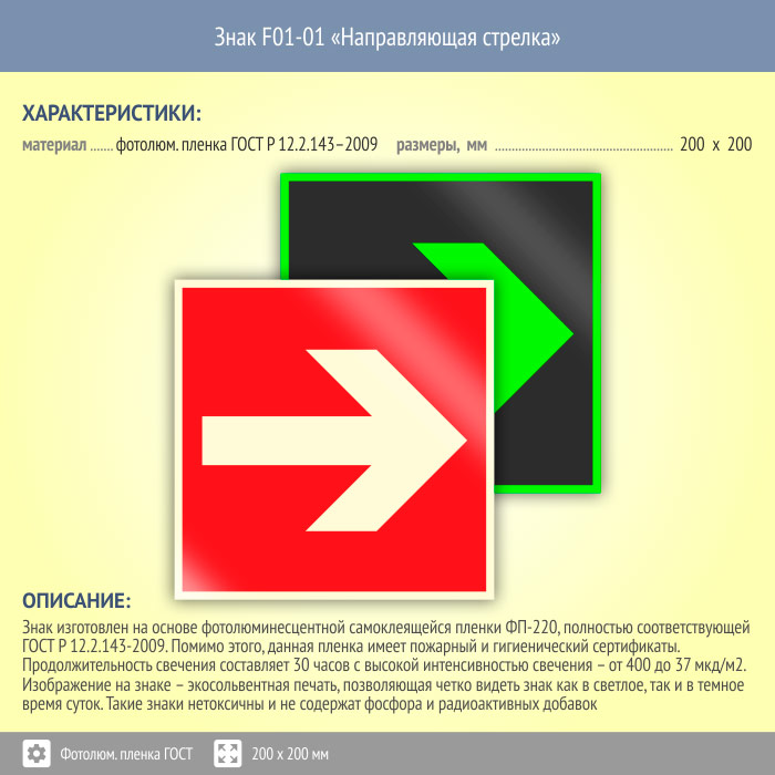Знак F01-01 «Направляющая стрелка» (фотолюминесцентная пленка ГОСТ 34428-2018, 200х200 мм) в Пензе купить