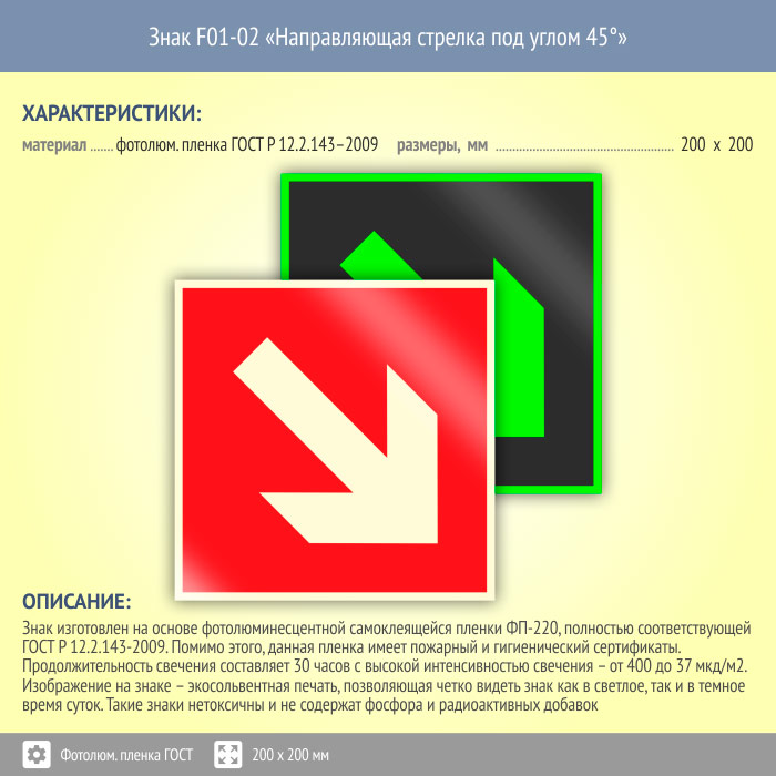 Знак F01-02 «Направляющая стрелка под углом 45°» (фотолюминесцентная пленка ГОСТ 34428-2018, 200х200 мм) в Пензе купить