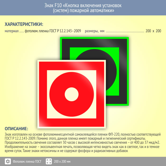Знак F10 «Кнопка включения установок (систем) пожарной автоматики» (фотолюминесцентная пленка ГОСТ 34428-2018, 200х200 мм) в Пензе купить