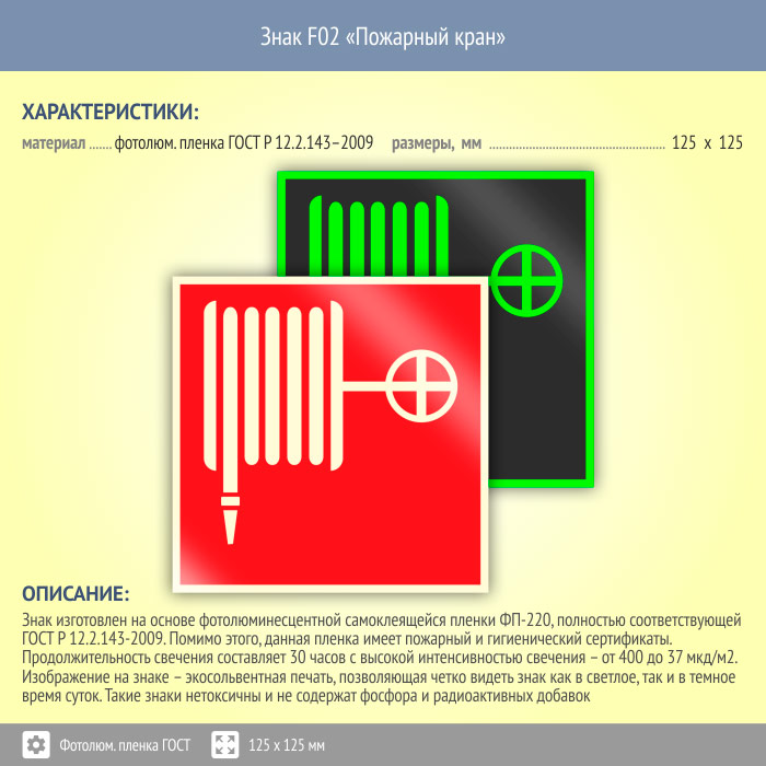 Знак F02 «Пожарный кран» (фотолюминесцентная пленка ГОСТ 34428-2018, 125х125 мм) в Пензе купить