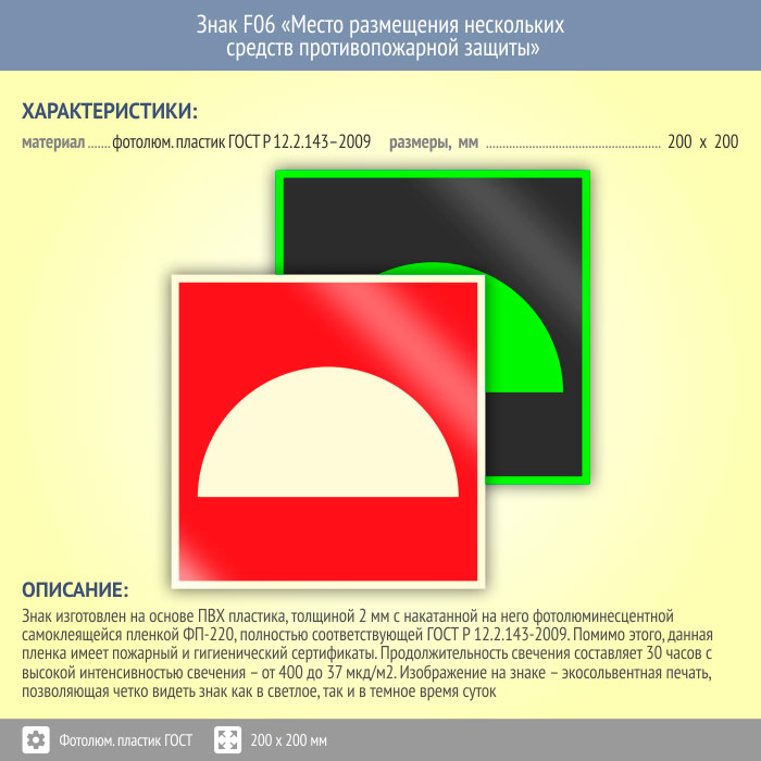 Знак F06 «Место размещения нескольких средств противопожарной защиты» (фотолюминесцентный пластик ГОСТ 34428-2018, 200х200 мм) в Пензе купить