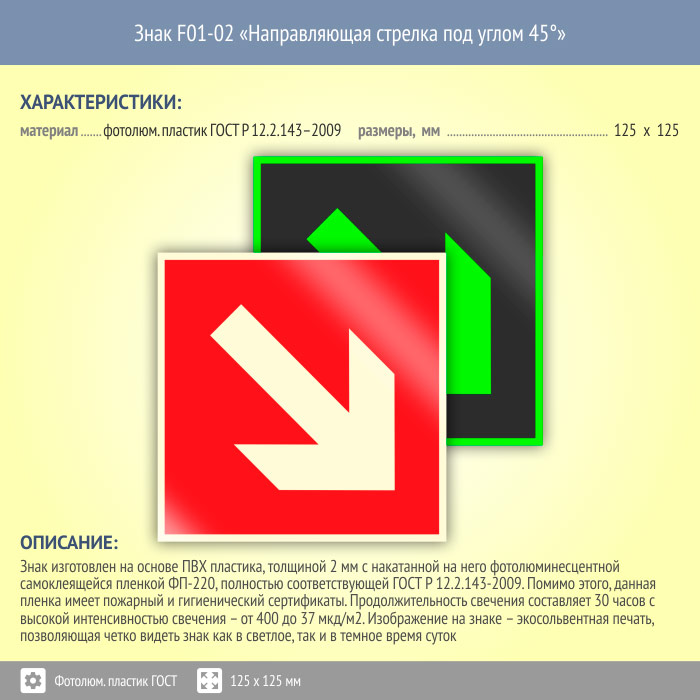 Знак F01-02 «Направляющая стрелка под углом 45°» (фотолюминесцентный пластик ГОСТ 34428-2018, 125х125 мм) в Пензе купить