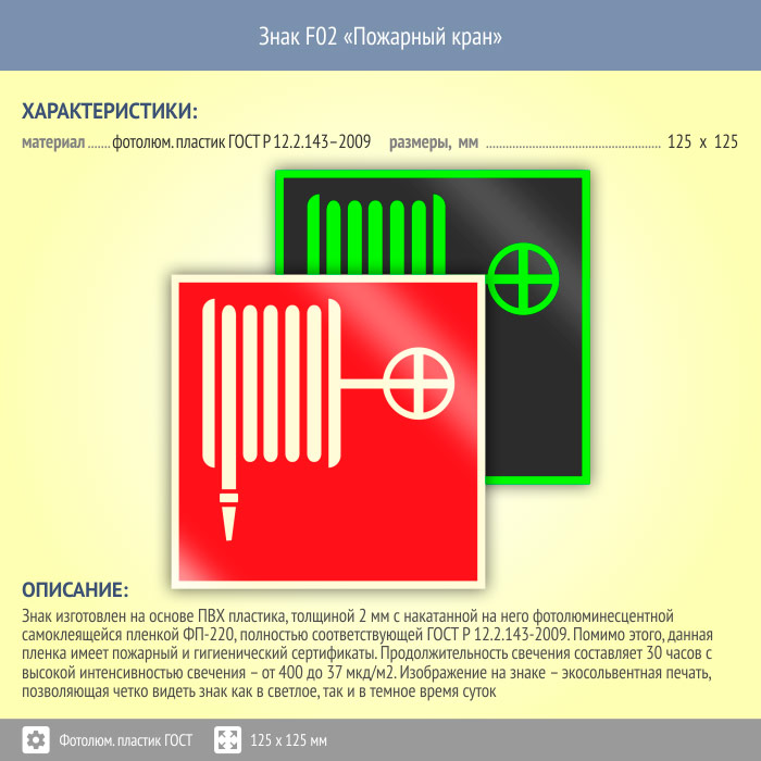Знак F02 «Пожарный кран» (фотолюминесцентный пластик ГОСТ 34428-2018, 125х125 мм) в Пензе купить