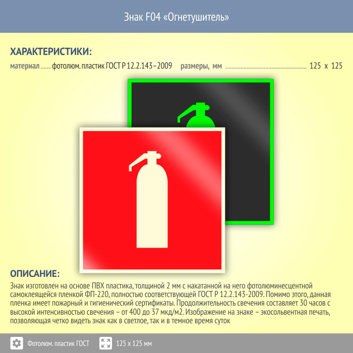 Знак F04 «Огнетушитель» (фотолюминесцентный пластик ГОСТ 34428-2018, 125х125 мм) в Пензе купить