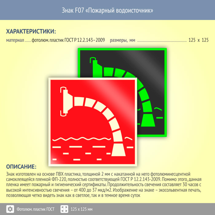 Знак F07 «Пожарный водоисточник» (фотолюминесцентный пластик ГОСТ 34428-2018, 125х125 мм) в Пензе купить