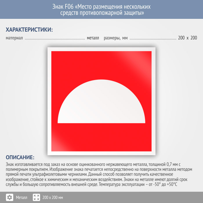 Знак F06 «Место размещения нескольких средств противопожарной защиты» (металл, 200х200 мм) в Пензе купить