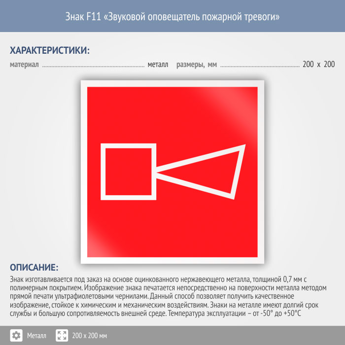 Знак F11 «Звуковой оповещатель пожарной тревоги» (металл, 200х200 мм) в Пензе купить